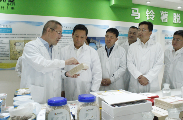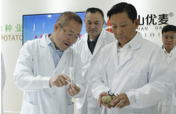 段志強(qiáng)一行首先參觀了民豐種業(yè)脫毒組培中心展廳,詳細(xì)了解了馬鈴薯脫毒種薯生產(chǎn)過程及企業(yè)發(fā)展情況。張國介紹,內(nèi)蒙古民豐種業(yè)有限公司成立于2008年,注冊資本1.3億元,已累計完成投資10億元以上,公司已發(fā)展成為集馬鈴薯種薯、訂單薯生產(chǎn)及馬鈴薯、燕麥深加工于一體的全產(chǎn)業(yè)鏈集團(tuán)化企業(yè),是“農(nóng)業(yè)產(chǎn)業(yè)化國家重點龍頭企業(yè)”、“國家高新技術(shù)企業(yè)”、“自治區(qū)扶貧龍頭企業(yè)”。目前,公司已發(fā)展成為一家融合農(nóng)業(yè)和食品加工業(yè)的全產(chǎn)業(yè)鏈集團(tuán)化公司,形成以食品加工帶動農(nóng)業(yè),以農(nóng)業(yè)服務(wù)食品加工,一、二、三產(chǎn)融合、農(nóng)商互聯(lián)齊頭并進(jìn)的良性發(fā)展業(yè)務(wù)格局。
